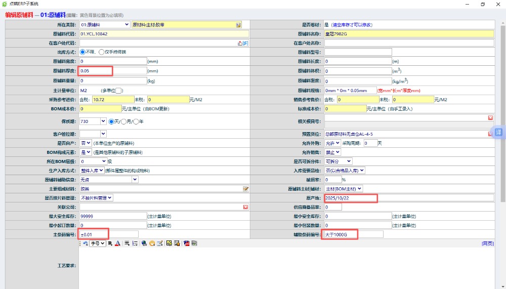 答:针对这个问题可以先在“系统管理”》“物料信息维护”中找到对应物料,然后对物料信息进行编辑,如:物料厚度、主条码编号和服辅助条编码进行修改。