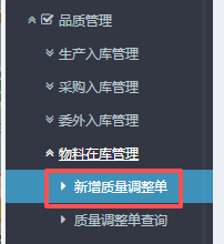 进入ERP系统之后,在左侧的功能菜单里找到“品质管理”,点开“物料在库管理”,点击“新增质量调整单”。