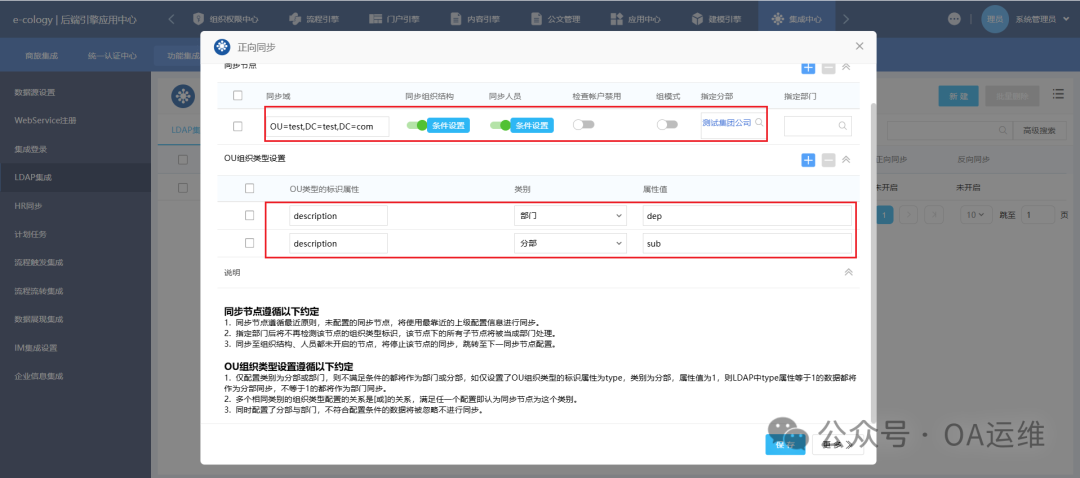 本次记录AD账号同步到泛微OA系统并开启LDAP认证的操作过程,逐步说明操作路径、LDAP集成的基础配置步骤,以指导完成相关集成与认证设置。
