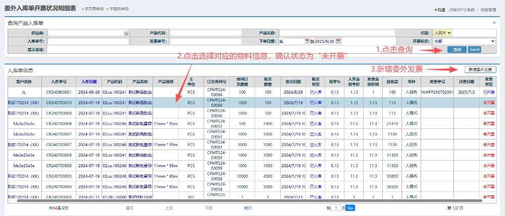 点晴模切ERP-委外入库开票查询-操作流程