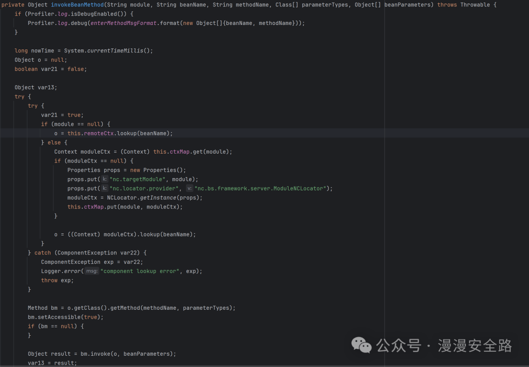 我这个代码是修复了这个漏洞以后的加了包名限制。这里其实和我们上面反射调用方法是一样的只不过这里是json格式上面是反序列化。所以我们看下"method":"uploadFile","className":"nc.itf.hr.tools.IFileTrans"修复了没还是只加了包名限制反射调用。