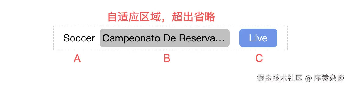 在开发中,我们常遇到这种布局:A、B、C 三段文本长度不固定,其中 A、C 占用空间较少,需要完整显示;而 B 是自适应区域,超出部分需省略显示。A 与 B 共享同一容器,该容器与 C 同级,容器应占据除 C 之外的所有剩余空间。HTML 结构如下: