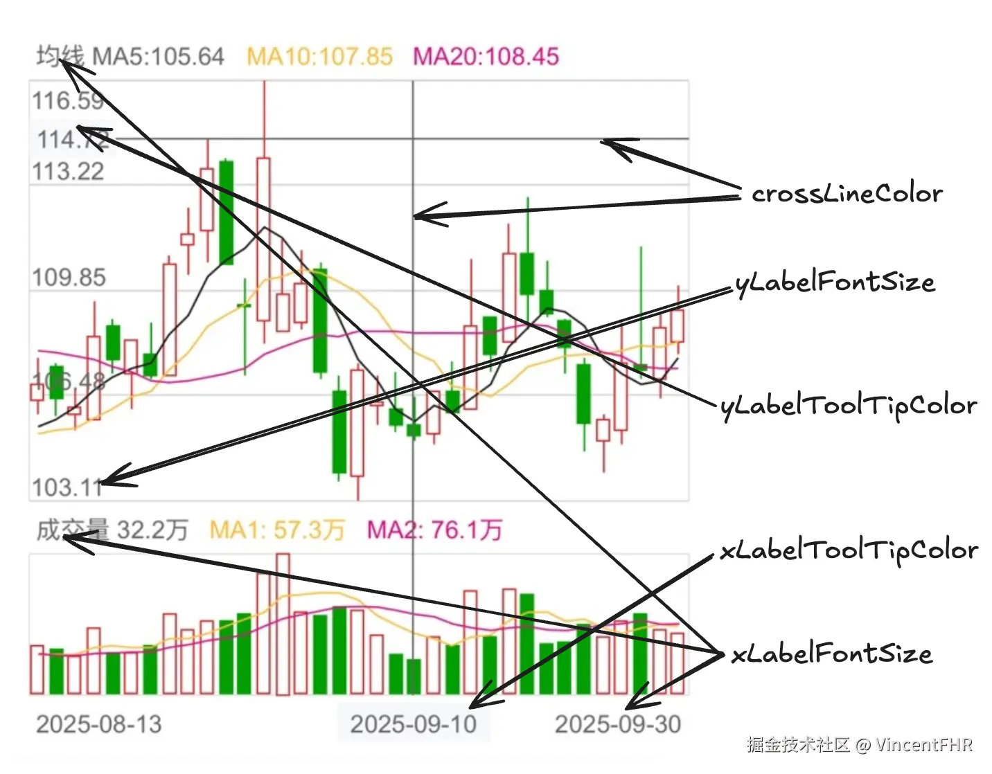 二、canvas 注意事项1、整数坐标,会导致模糊canvas 在画线段, 通常会出现以下代码: 假设上面的两个点是(1,10)和(5,10),那么画出来的实际上是一条横线, 但是 canvas 不是这样处理的, canvas 默认线条会与整数对齐, 并且由于粗度被拉伸,颜色也会被淡化,那怎么解决这个问题呢? 处理方式也很简单, 通过 cxt.translate(0.5, 0.5) 将坐标往下移动 0.5 个像素, 典型的代码如下: 在我的代码中, 也体现了类似的处理。 2、如何处理高像素比带来的模糊设备像素比越高,理论上应该越清晰,因为原来用一个小方块来渲染1px, 现在用2个(dpr=2的情况)小方块来渲染,应该更清晰才对,但是canvas不是这样的。 例如,通过js获取父容器 div 的宽度是 width, 这时候如果设置 canvas.width = width,在设备像素比为2的时候, canvas 画出来的宽度为css对应宽度的一半, 如果强制通过 css 将 canvas 宽度设置为 width, 则 canvas 会被拉长一倍, 导致出现锯齿模糊。 注意了吗?上面所说的 canvas.width=width 与 css 设置的 #canvas { width: width } 起到的效果是不一样的。不要随便通过 css 去设置 canvas 的宽高, 容易被拉伸变形或者导致模糊。 通用的处理方式是: 三、样式配置为了方便样式自定义, 我独立出一个默认的配置对象 defaultKlineConfig, 参数的含义如下图所示,其实下图这个风格的标注, 是通过 excalidraw 这个软件画的, 也是 canvas 做的开源软件, 可见 canvas 在前端可视化领域的重要性, 这个扯远了,打住。