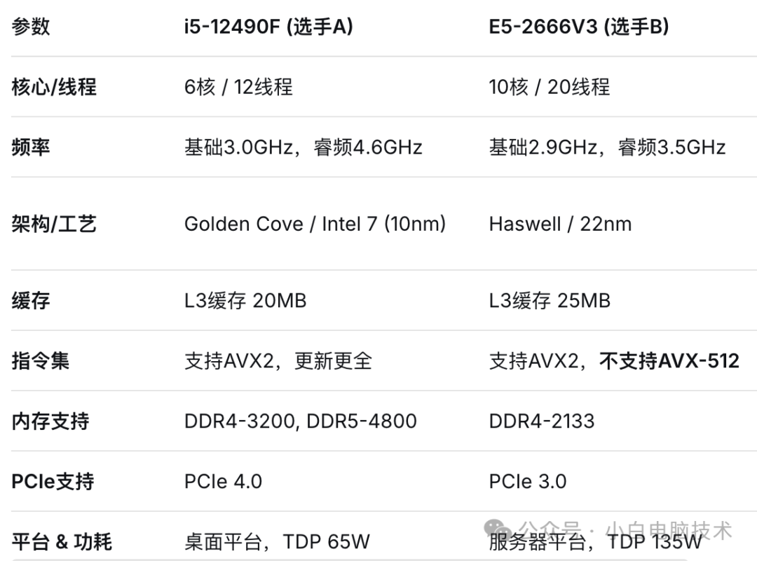 今天,小白就来讲讲这个问题。为了让大家有最直观的感受,我们会请出两位风格迥异的选手:酷睿i5-12490F和至强E5-2666v3。看完它们的对决,你自然会找到答案。