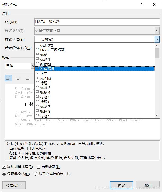 因此,我们就新建一个新的样式——只要这个新建的样式没有首行缩进,然后将所有标题的“样式基准”设置为这个新建的样式即可。