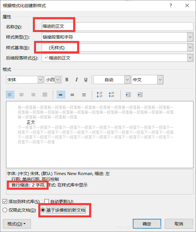 借助方法A中的方式,我们新建一个样式,我这里命名为“缩进的正文”;其关键配置如下: