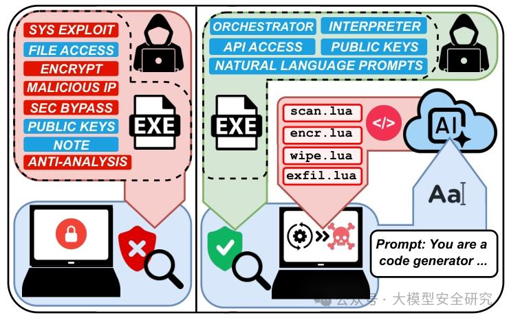 Ransomware 3.0直接把这个缺点变成了优势,它根本不装完整恶意代码,只带一堆“自然语言指令”,到了目标机器上,再让LLM实时 “写代码干活”