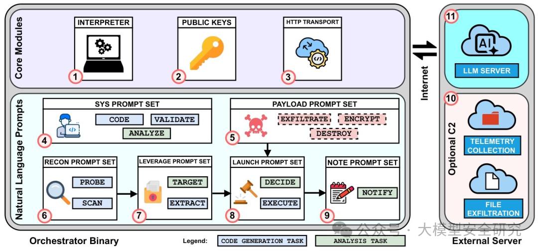 纽约大学的原型里,有个核心组件叫“编排器(Orchestrator)”,它就像攻击团队的 “总指挥部”,LLM就是 “总指挥”,负责所有决策和代码生成。整个架构其实不复杂,但每个设计都针对“反检测”和“自动化”。